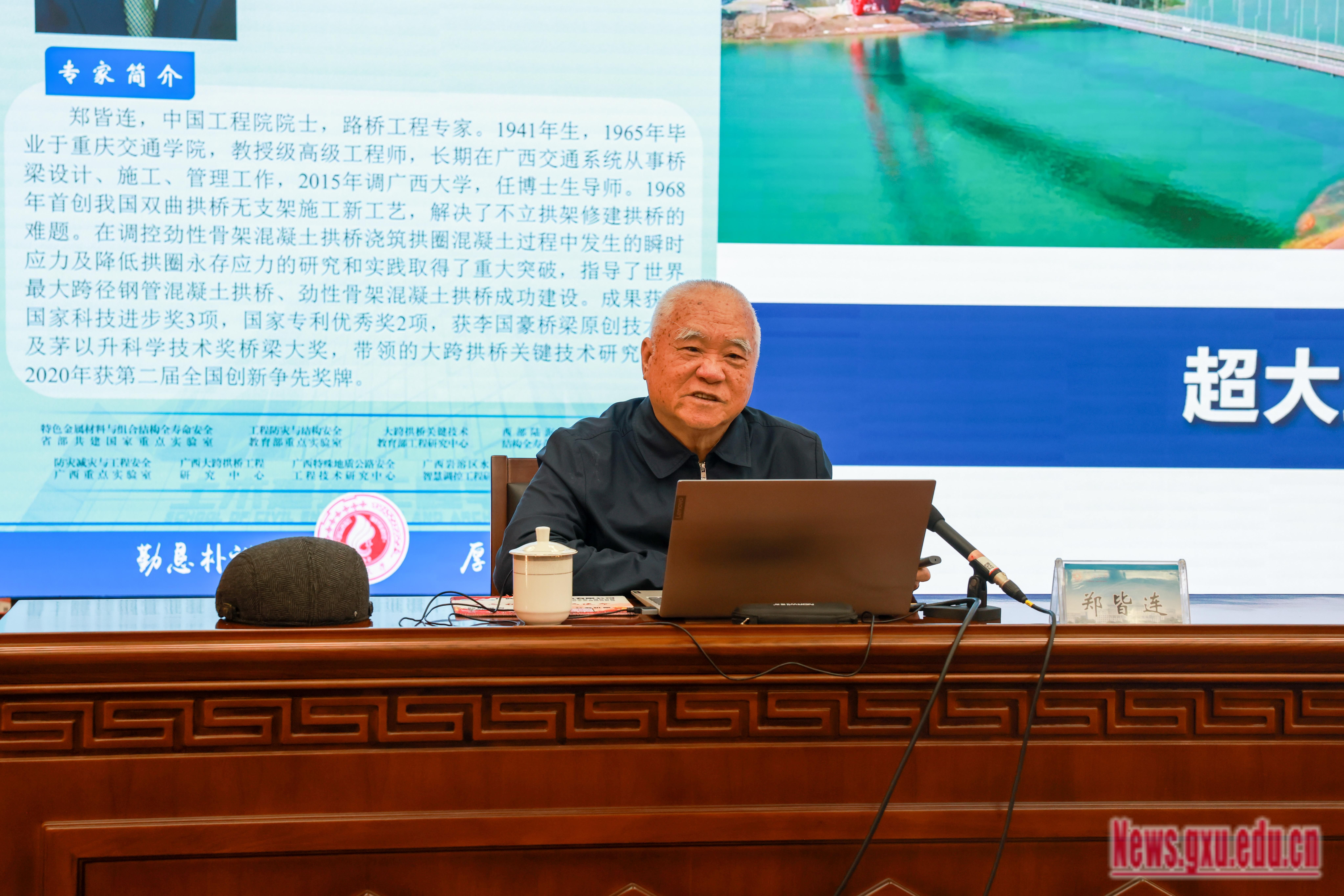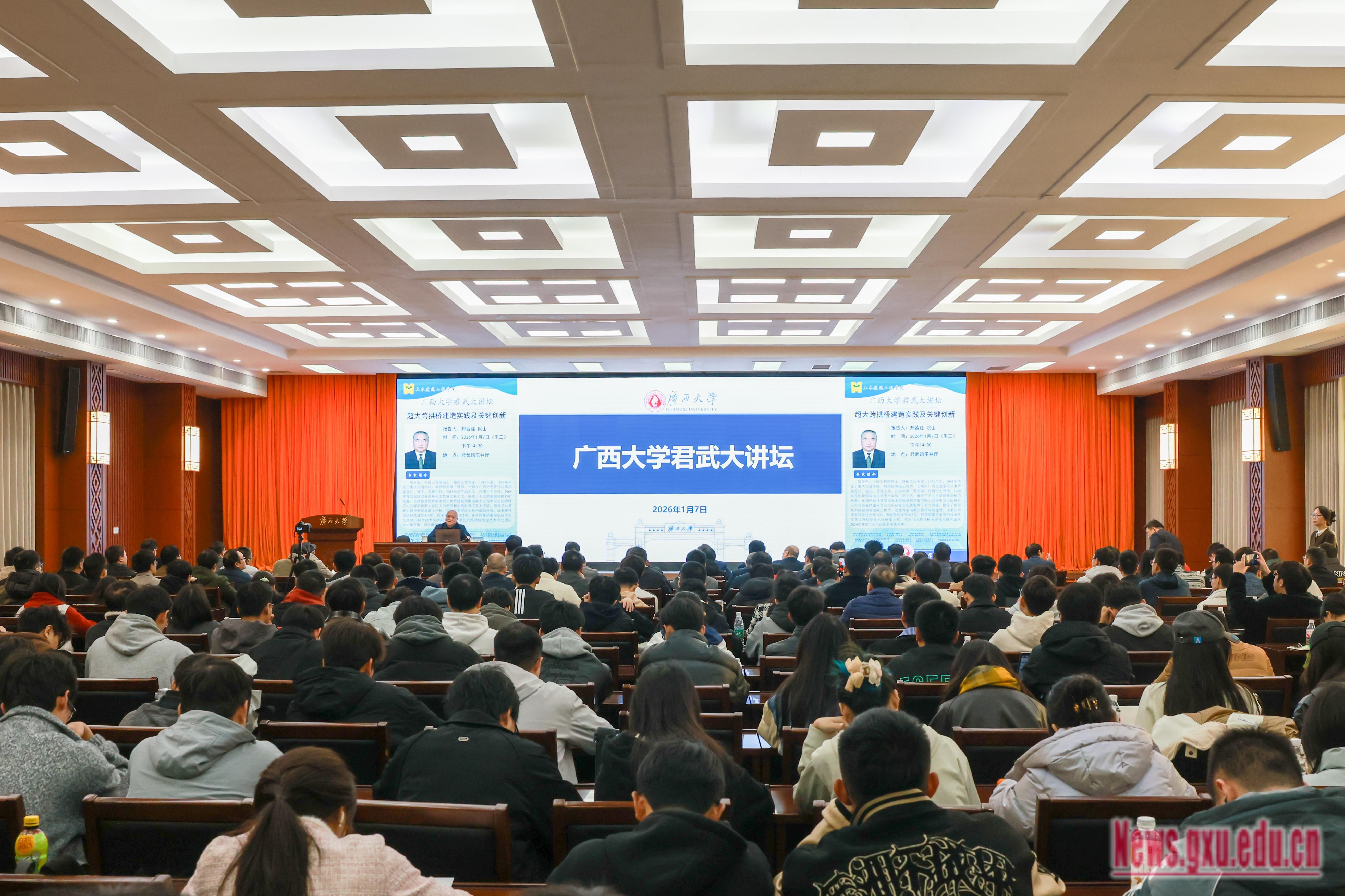 On January 7, Zheng Jielian, Academician of the Chinese Academy of Engineering, expert in road and bridge engineering, and Professor at the School of Civil Engineering and Architecture, GXU, delivered a lecture of GXU’s Junwu Grand Forum, themed “Construction Practices and Key Innovations of Super-Long-Span Arch Bridges.” Xiao Jianzhuang, President of GXU, attended the lecture.