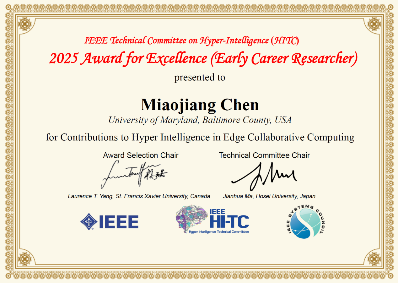Recently, the IEEE Hyper-Intelligence Technical Committee (IEEE HITC) announced the recipients of the IEEE HITC 2025 Young Scientist Award. Chen Miaojiang, a faculty member of the School of Computer, Electronics, and Information at Guangxi University (GXU), was honored for his outstanding contributions to hyper-intelligence in edge collaborative computing. This marks the first time a young scholar from GXU has received the award.