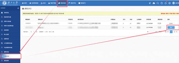 登录研究生管理系统,点击我的培养—>课程评价—>操作栏中的“评价”。如图所示。
