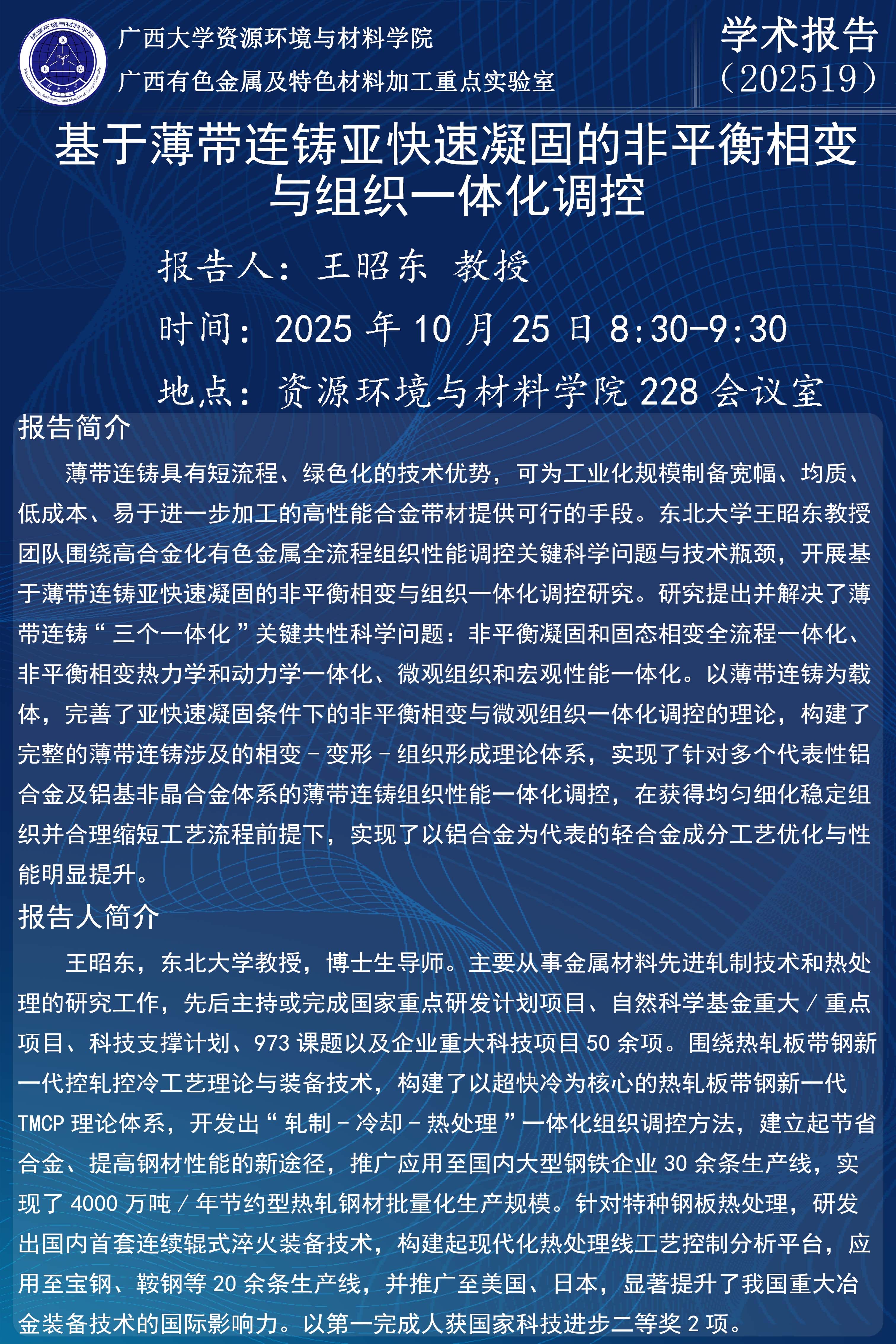 资源环境与材料学院学术报告:基于薄带连铸亚快速凝固的非平衡相变与组织一体化调控