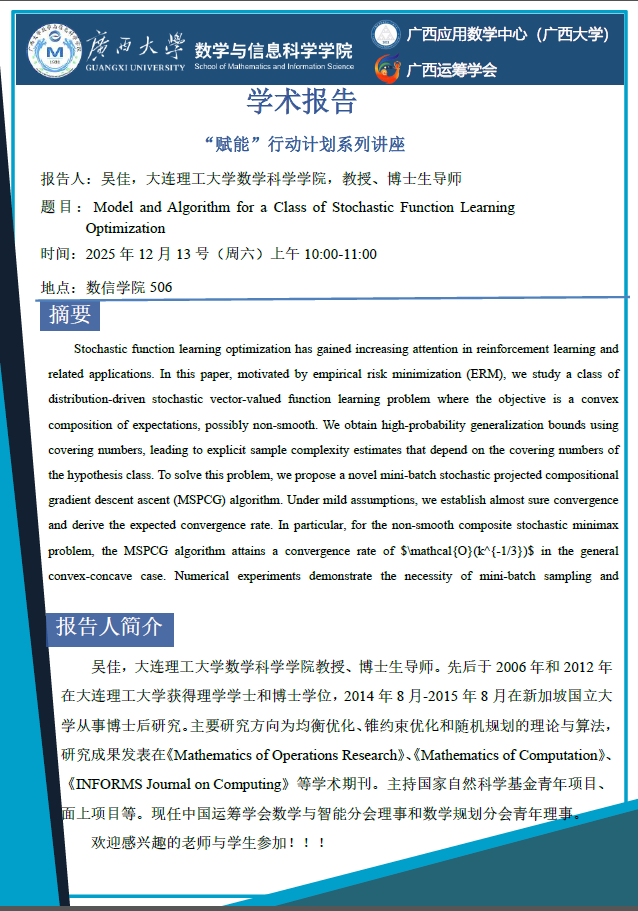 数学与信息科学学院学术报告:Model and Algorithm for a Class of Stochastic Function Learning Optimization