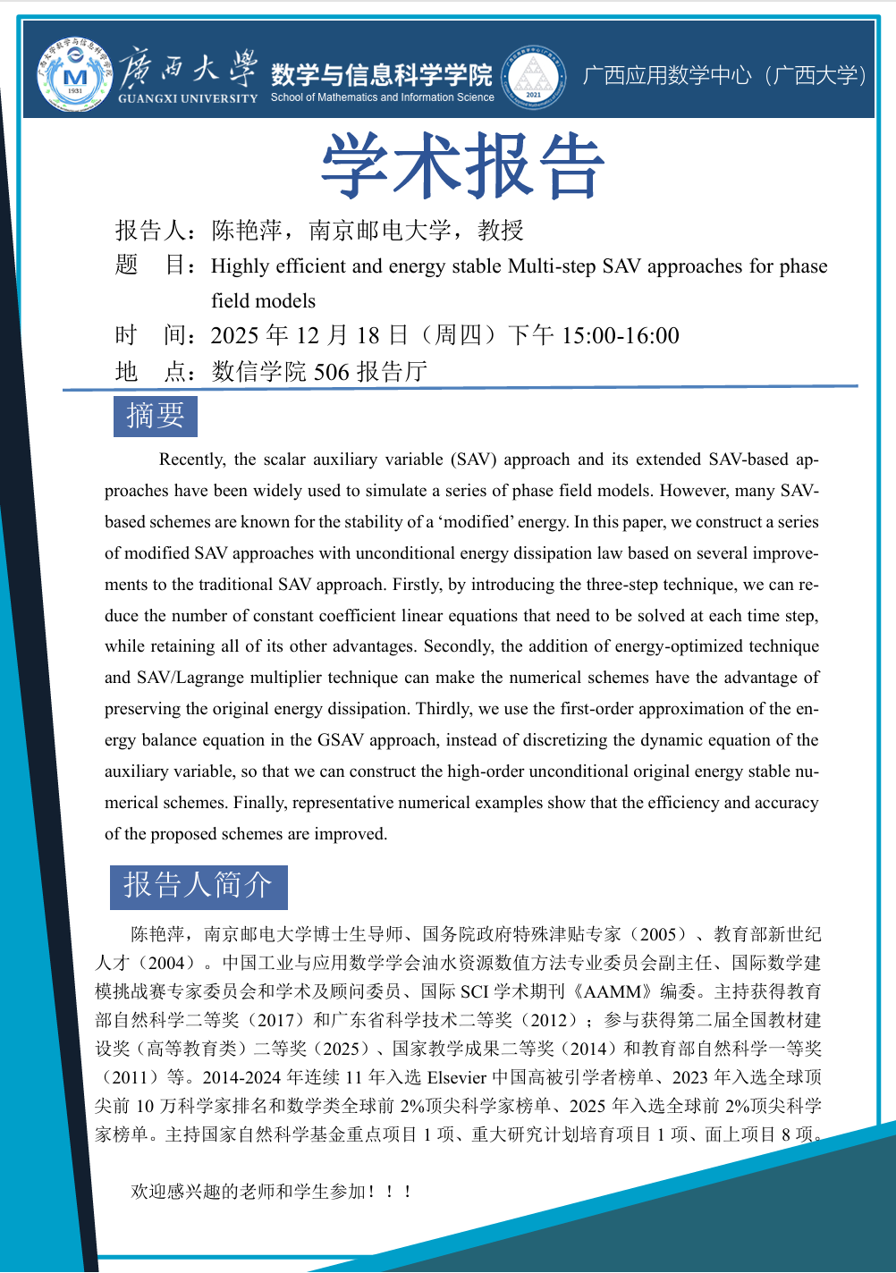 数学与信息科学学院学术报告:Highly efficient and energy stable Multi-step SAV approaches for phase field models