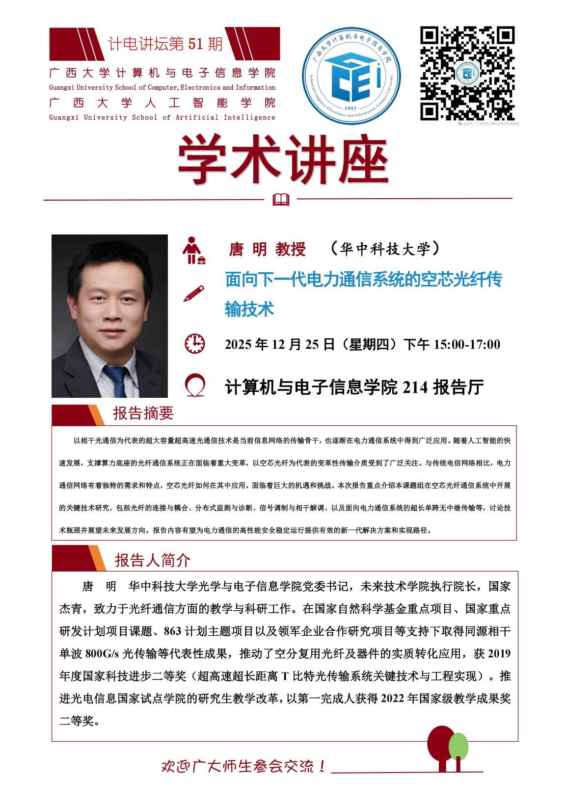 “计电讲坛”学术报告系列活动第51期:面向下一代电力通信系统的空芯光纤传输技术