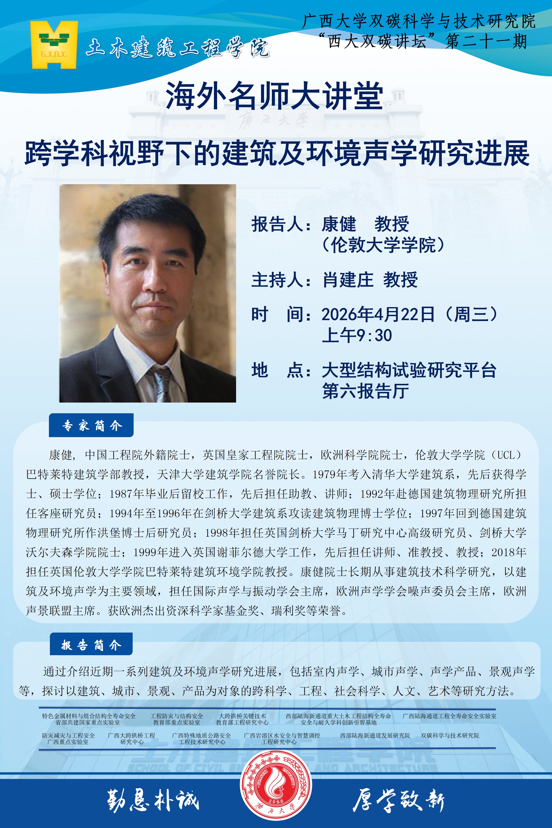 海外名师大讲堂、土木建筑工程学院学术报告:跨学科视野下的建筑及环境声学研究进展